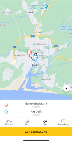 Laden Sie sich im Appstore die Taxi.de App runter und bestellen Sie Ihr Fahrzeug direkt per App.
